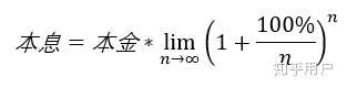 (分析:这取决于银行多长时间对你的本金核算一次。若一年核算一次本金,那一年后就得到2倍的钱。但是如果半年核算一次本金呢?三分之一年核算一次本金呢?……每天、每小时、每分钟核算一次本金呢?)一年内内核算本金次数记为n,列式如下: